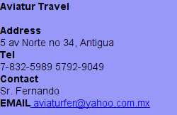 Aviatur Travel Address 5 av Norte no 34, Antigua Tel 7-832-5989 Contact Sr. Fernando |